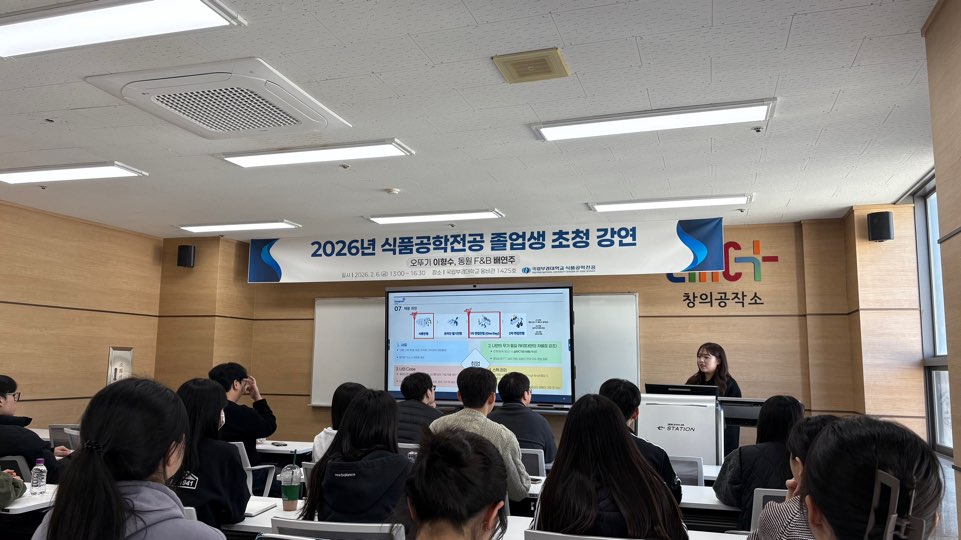 [2026년 식품공학전공 졸업생 초청 강연 개최] 식품공학전공에서는 재학생들의 진로 설계 및 취업 이해도 향상을 위해 이번 강연은 식품 산업 현장에서 활발히 활동 중인 졸업생인 재학 시절 경험부터 취업 준비 과정, 현재 담당 업무에 이르기까지 재학생들이 전공과 연계된 다양한 진로 방향을 구체적으로 고민해볼 수 있는 계기가 되었습니다.
